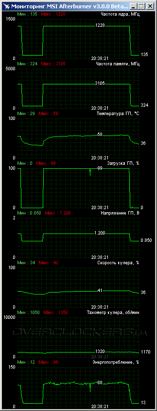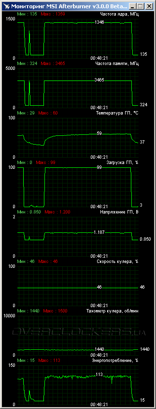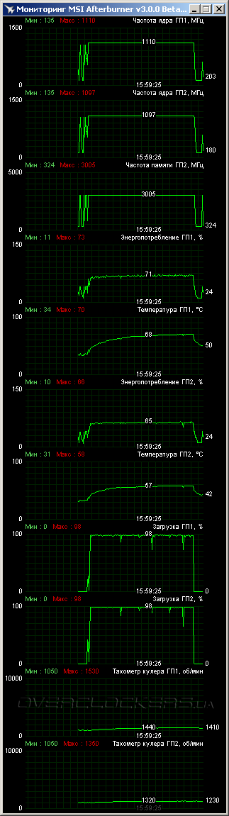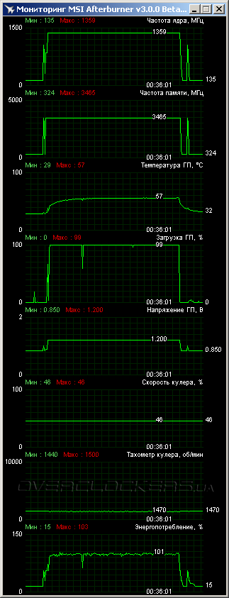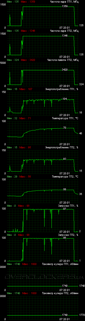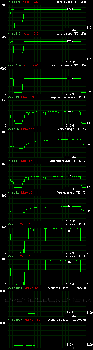 Для разогнанного режима нами была немного повышена скорость вращения вентиляторов — до 1500 об/мин. Рост температур при таком охлаждении оказался мизерным, а шум все еще укладывался в рамки критерия «тихо». Отметим, что в Unigine Valley benchmark частота периодически снижалась до 1333–1346 МГц. Но такое наблюдалось лишь в одном этом приложении, во всех остальных тестах — стабильные 1359 МГц.
