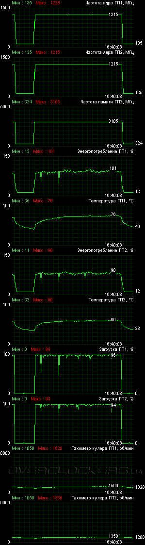 Реальная частота ядра стабильно держалась на отметке 1228 МГц. Это самое большое значение частоты Boost среди всех протестированных нами видеокарт GeForce GTX 760. Хотя по базовому значению данная модель уступает Palit GTX 760 JetStream и MSI N760 TF 2GD5/OC в режиме OC.