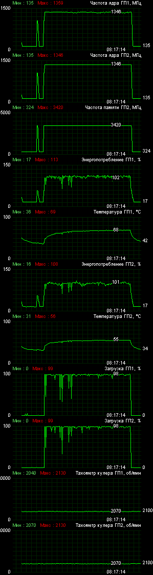 Самой холодной оказалась нижняя видеокарта. Верхняя горячее, поскольку весь воздух под ней прогревается нижней картой. Ее температуры достигали 72–76 °C, а это в сравнении с одиночным режимом на 16–17 °C выше. Еще стоит отметить разную частоту Boost у Inno3D iChill, хотя расхождение минимально — вторая карта работала на 1215 МГц.