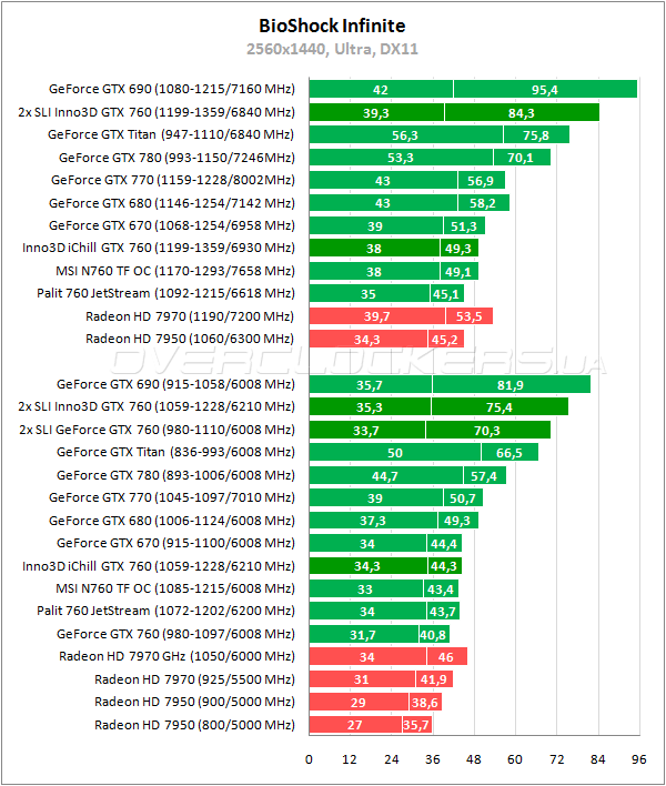 Inno3D iChill в BioShock Infinite держится на уровне GeForce GTX 670, чуть уступая этой карте при разгоне. Разница с разогнанным MSI почти отсутствует. Среди соперников AMD герой обзора уступает только Radeon HD 7970 GHz Edition и совсем немного. Добавление второй карты дает прирост 72% по средней частоте кадров. А вот по минимальному параметру на SLI наблюдаются редкие просадки практически до уровня одиночной карты. Аналогичная ситуация и на GeForce GTX 690. Стоит отметить, что этот флагман в данный раз обходит пару Inno3D iChill.