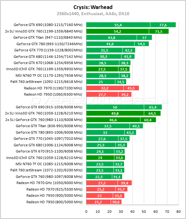 Высокие заводские частоты обеспечивают Inno3D преимущество 8% над референсом и выигрыш 2% относительно карты MSI. А вот при разгоне мы видим, как в Warhead лучшие результаты показывает MSI. Но, опять же, разница минимальная. При сравнении простой версии GeForce GTX 760 в одиночном режиме и в SLI мы видим реальный двукратный прирост. Это в полной мере актуально и для видеокарт Inno3D iChill. Две такие карты немного уступают GeForce GTX 690. Парочка референсов быстрее Titan.
