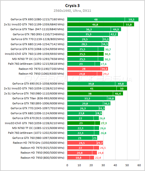 В Crysis 3 у героя данного обзора преимущество над обычной версией 6–10%. Разница с другими нестандартными GeForce GTX 760 менее 3%. Небольшое преимущество по средней частоте кадров над GeForce GTX 670 в номинале и паритет при разгоне. Отставание от старшего Radeon весьма скромное. Добавление второй карты повышает производительность на 80–86%.