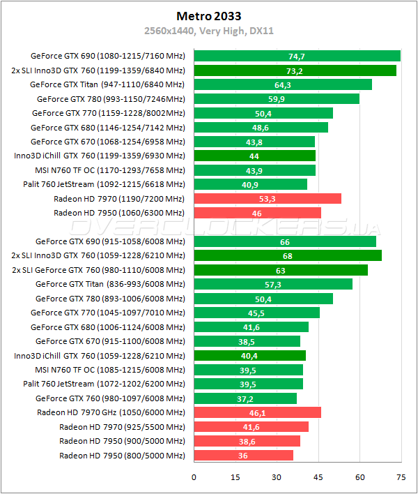 В Battlefield 3 карта Inno3D лучше всех собратьев серии GTX 760, хотя разница с MSI минимальная. В номинале GeForce GTX 670 чуть слабее, при разгоне чуть быстрее нашего героя. SLI из двух GeForce GTX 760 быстрее одиночной карты на 80–90%. Обычные карты занимают среднюю позицию между Titan и GeForce GTX 690, парочка Inno3D держится на одном уровне с двухпроцессорным флагманом.