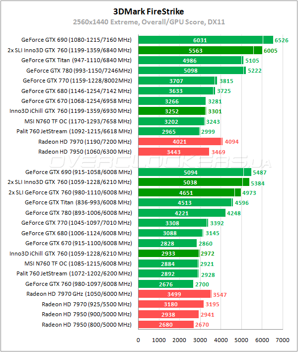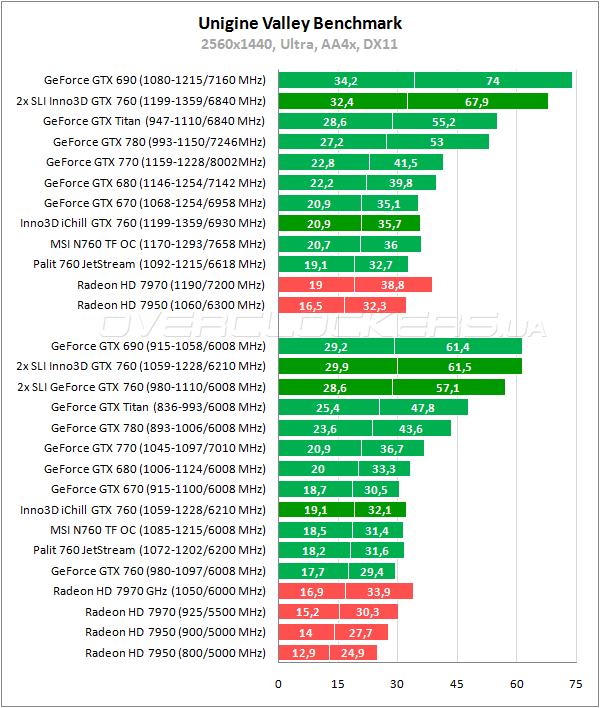 В данном случае Inno3D уже уступает Radeon HD 7970 около 8%. Разгон позволяет добиться максимального прироста относительно стандартной версии GeForce GTX 760 в 22%. Масштабируемость SLI хуже. Вторая карта обеспечивает ускорение на 72–74%.