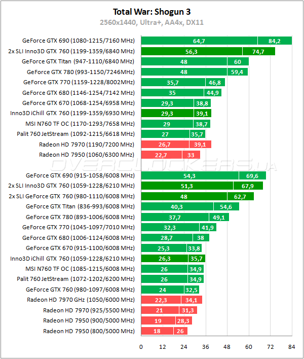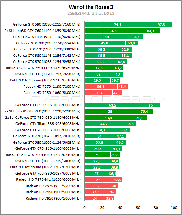 В War of the Roses Inno3D немного обходит простой Radeon HD 7970 и уступает GeForce GTX 670. Разница с референсом менее 9%. Вторая карта дает полноценный двукратный прирост. Пара разогнанных GeForce GTX 760 сопоставимы с GeForce GTX 690 на заводских частотах.