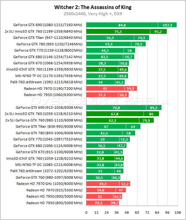 Во втором «Ведьмаке» мизерное отставание рассматриваемого GeForce от Radeon HD 7970 и крошечное преимущество относительно GeForce GTX 670. Прирост от второй карты в SLI достигает 100%.