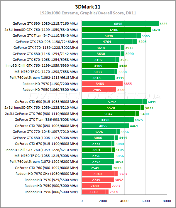 У Inno3D преимущество в 10% относительно референса и 2% относительно простой версии Radeon HD 7970. Вторая карта в SLI дает прирост в 98%.