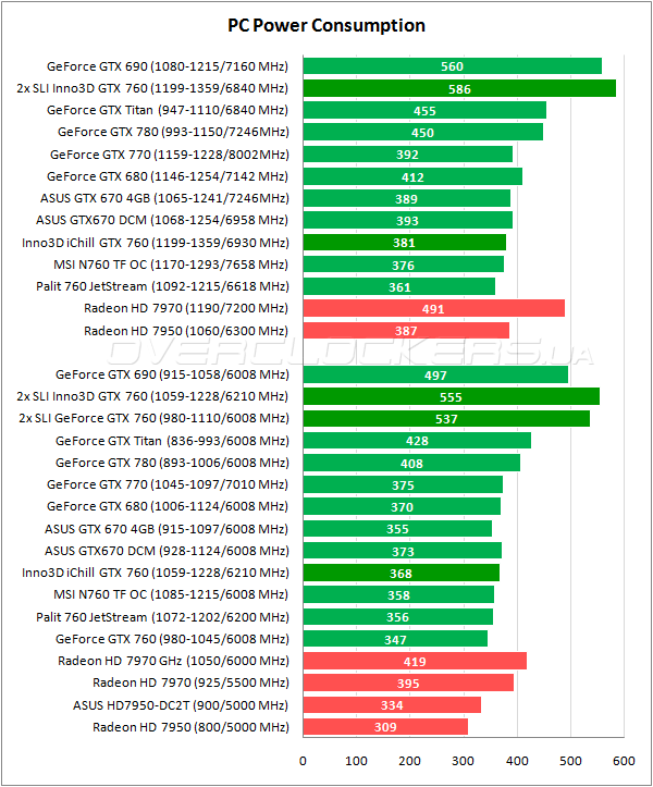 В данном сравнении количество участников немного расширено за счет двух версий GeForce GTX 670. Основная версия демонстрировал не лучшие показатели энергопотребления, для наглядности пришлось добавить и другую модель от того же производителя. Это в свою очередь говорит о том, что полной идентичности по данному критерию нет даже между картами одной серии. Все еще зависит от схемотехники каждой конкретной модели и заводских настроек. Поэтому не стоит забывать, что в роли стандартных карт у нас выступают оверклокерские версии GeForce GTX 770 и Radeon HD 7970 на пониженных частотах. Для последней карты снижалось и напряжение. Для самого простого режима Radeon HD 7950 (она же ASUS HD7950-DC2T-3GD5) устанавливалось напряжение 0,993 В, при частоте 900 МГц напряжение 1,094 В, а в разгоне — 1,194 В. У всех GeForce GTX 760 номинальное напряжение 1,2 В.