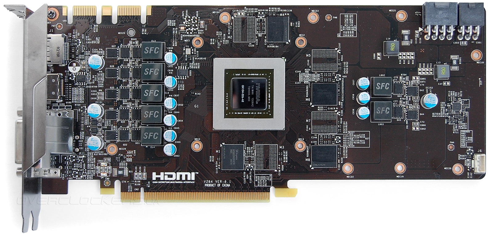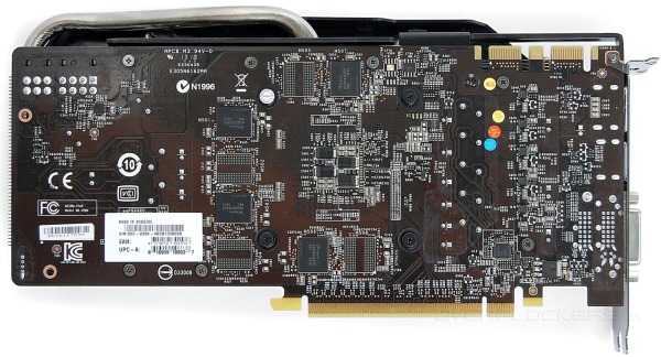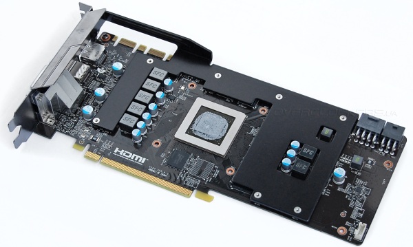 Половина микросхем памяти распаяна с обратной стороны платы. На одном из винтов, фиксирующих кулер, имеется наклейка. Так что производить какие-то манипуляции с охлаждением без потери гарантии на удастся. Хотя тут охлаждение столь мощное, что замену осуществлять смысла нет. Питание подключается к восьми- и шестиконтатному разъемам. Два разъема под SLI вместо одного у старого GeForce GTX 660.