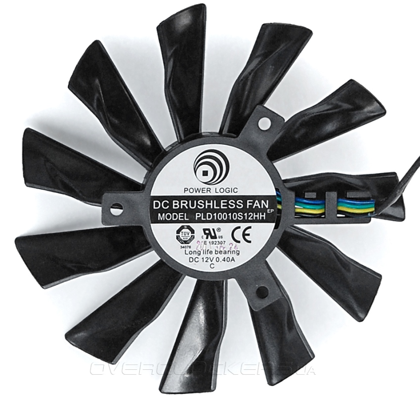 Два вентилятора Power Logic PLD10010S12H диаметром 100 мм монтируются на кожух. Последний прикручивается к двум узким пластинам на радиаторе. У старых Twin Frozr крепление вентиляторов включало более громоздкие и массивные рамки, создававшие большее сопротивление воздушному потоку. Лопасти вентиляторов имеют особые изогнутые края, что помогает увеличит зону обдува.
