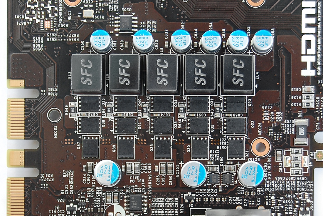 Подсистема питания ядра насчитывает пять фаз. Управляющие функции возложены на контроллер RT8800A. Напомним, что GeForce GTX 660 Ti и GeForce GTX 670 референсного дизайна используют четыре фазы.