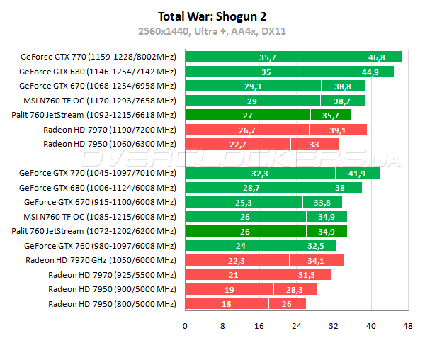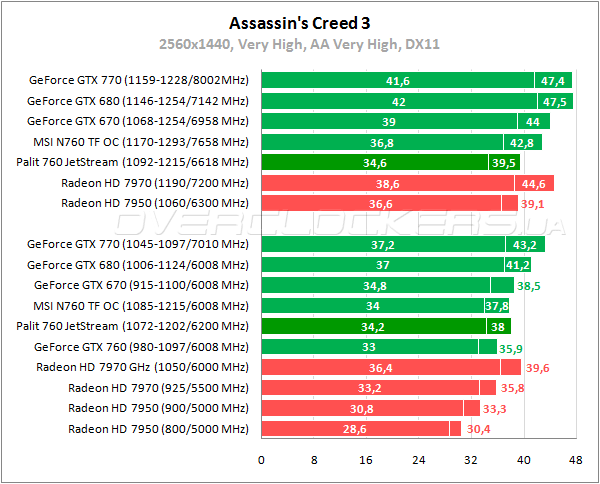 Герой обзора показывает мизерное превосходство над MSI N760 TF 2GD5/OC в Assassin’s Creed. Среди конкурентов AMD быстрее Palit оказывается только Radeon HD 7970 GHz Edition. Разогнанный JetStream заметно уступает MSI и вполне сопоставим с форсированным Radeon HD 7950.