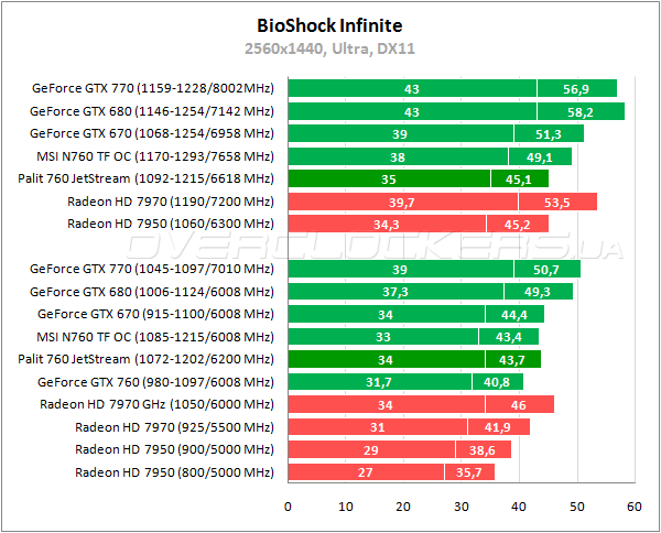 В BioShock Infinite разница между Palit и референсом 7%. Менее 2% разницы с GeForce GTX 670, и только по среднему fps. Минимальное отставание по этому параметру от старшего Radeon — 5%. Разгон дает скромный прирост в 3%.