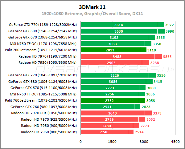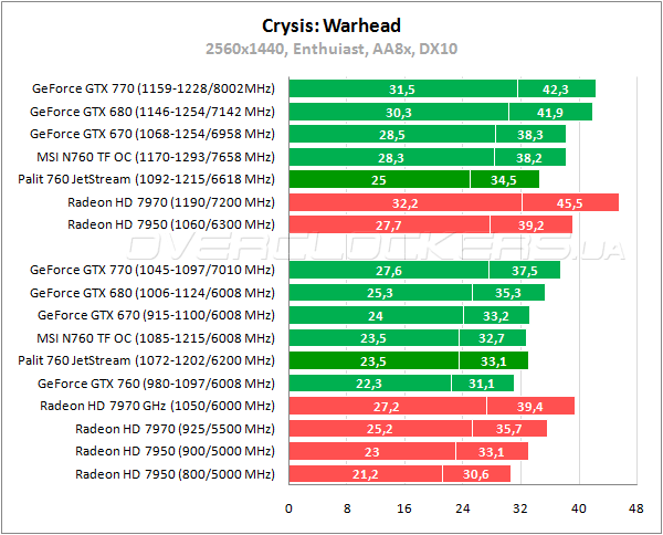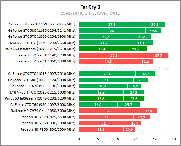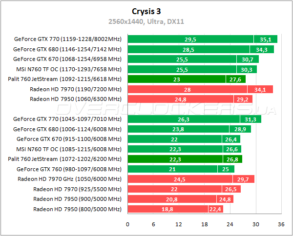Palit в Crysis 3 обходит стандартную версию GeForce GTX 760 на 6–7% и на 1% обходит простой Radeon HD 7970. Но в разгоне JetStream немного уступает даже форсированному Radeon HD 7950.