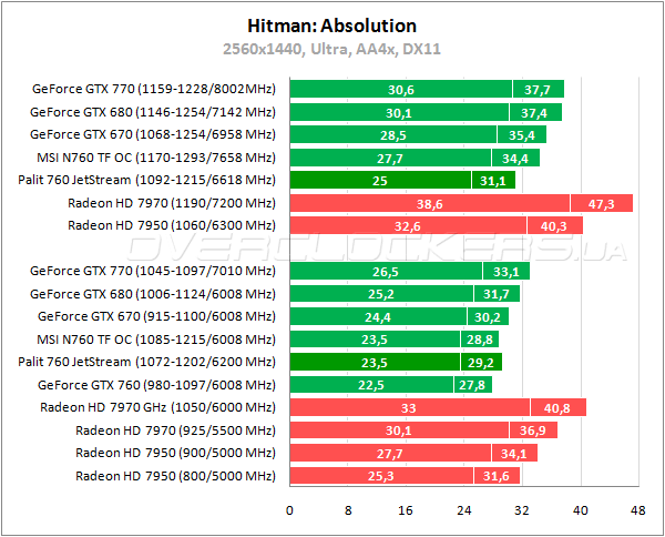 Последняя часть Hitman демонстрирует лучшие результаты на картах AMD. В данном случае GeForce GTX 760 уступает Radeon HD 7950 во всех режимах.