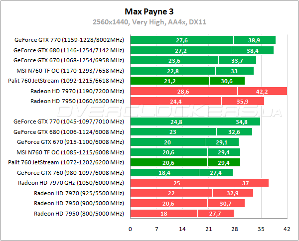 Идентичные результаты у Palit и MSI в Max Payne 3, мизерный отрыв от GeForce GTX 670. Одинаковый минимальный fps со старшим Radeon HD 7950, но небольшое отставание по средней частоте кадров.