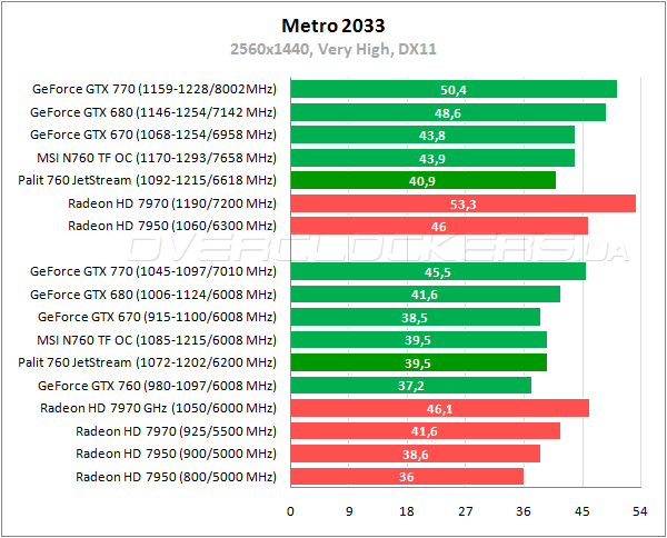 Palit и MSI в Metro 2033 идут наравне при заводских частотах, а при разгоне N760 TF 2GD5/OC быстрее на 7%. В номинале герой обзора немного лучше старшего Radeon HD 7950, но при разгоне слабее конкурента.