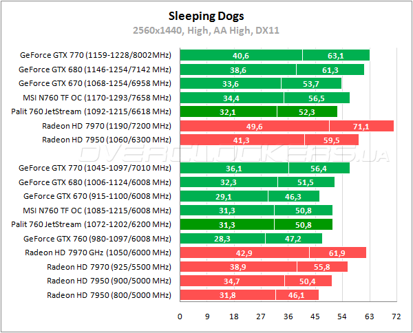 В Sleeping Dogs Palit практически не уступает GeForce GTX 680. Но надо учитывать разную версию драйверов для этих карт, что вероятно и обеспечило соответствующее ускорение для новичка. По средней частоте кадров Palit сопоставим со старшим Radeon, по минимальному показателю немного слабее.