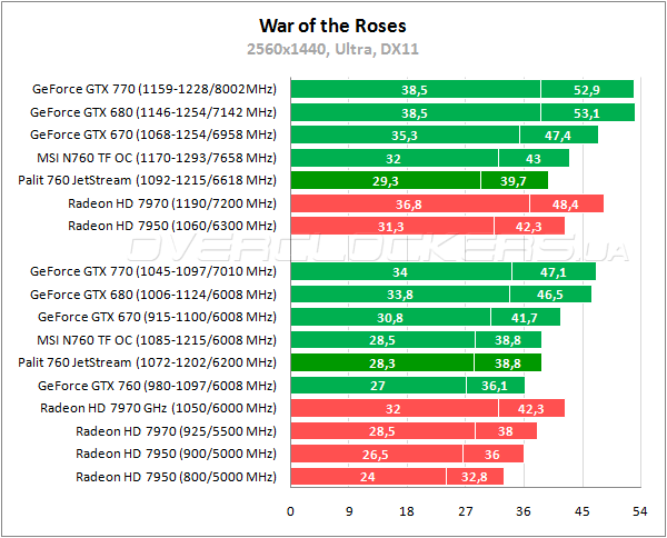 В номинале Palit JetStream демонстрирует уровень производительности обычного Radeon HD 7970. Прирост от разгона в War of the Roses минимальный — лишь 2%.