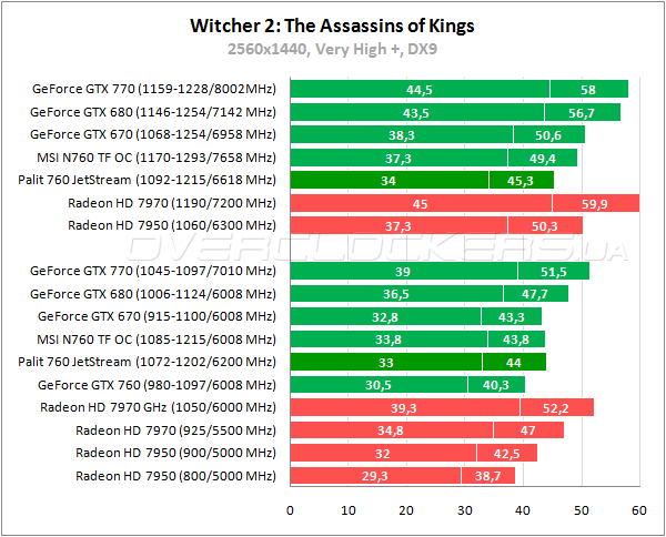 Во втором «Ведьмаке» у Palit небольшое преимущество над простым Radeon HD 7970. В номинале карта чуть лучше GeForce GTX 670. Но при разгоне JetStream проигрывает всем.