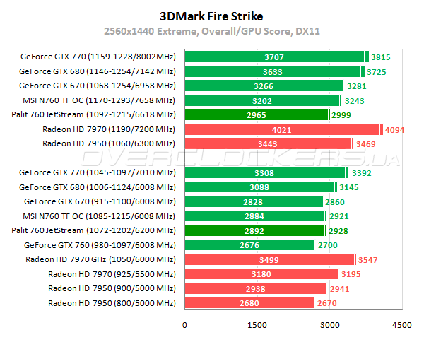 Идентичные результаты двух нестандартных GeForce GTX 760 и крошечное преимущество над Radeon HD 7970 менее 0,5%. Разгон дает прирост Palit в 2%.
