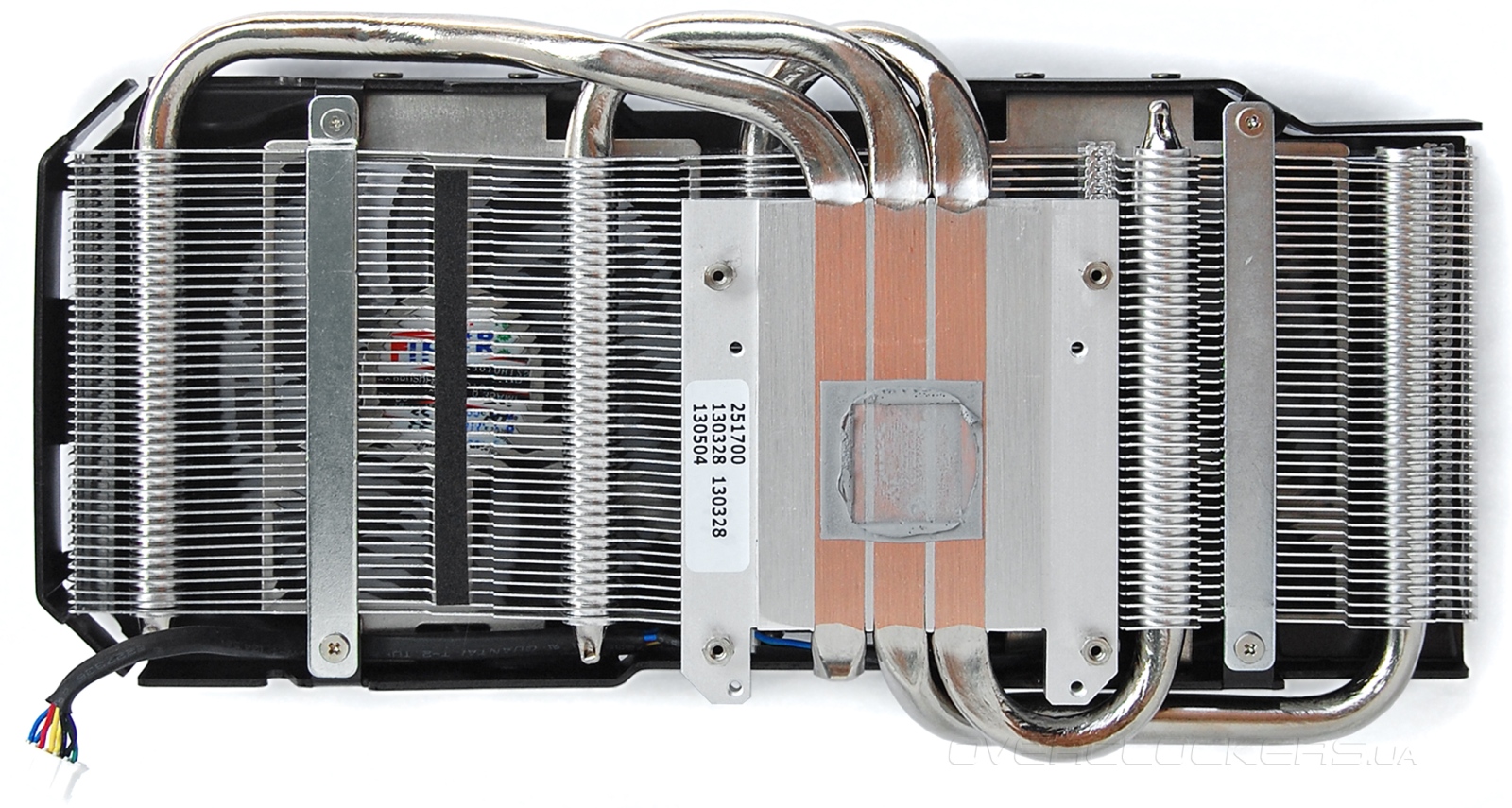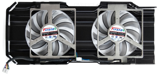 Сверху на радиатор прикручивается металлический кожух с парой вентиляторов FirstD FD7010H12S диаметром 80 мм. На фоне MSI N770 TF 2GD5/OC с парой 100-мм вентиляторов данное решение конечно выглядит скромно.
