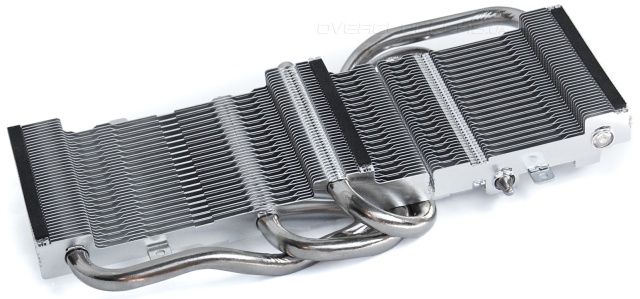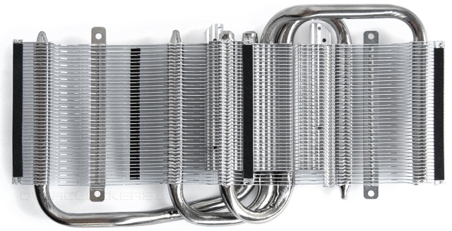 Кулер насчитывает три толстые тепловые трубки, которые, изгибаясь, пронизывают массив тонких алюминиевых пластин, плотно подогнанных друг к другу. Благодаря технологии прямого контакта поверхность трубок напрямую соприкасается с поверхностью кристалла, что обеспечивает максимально эффективный отвод тепла.