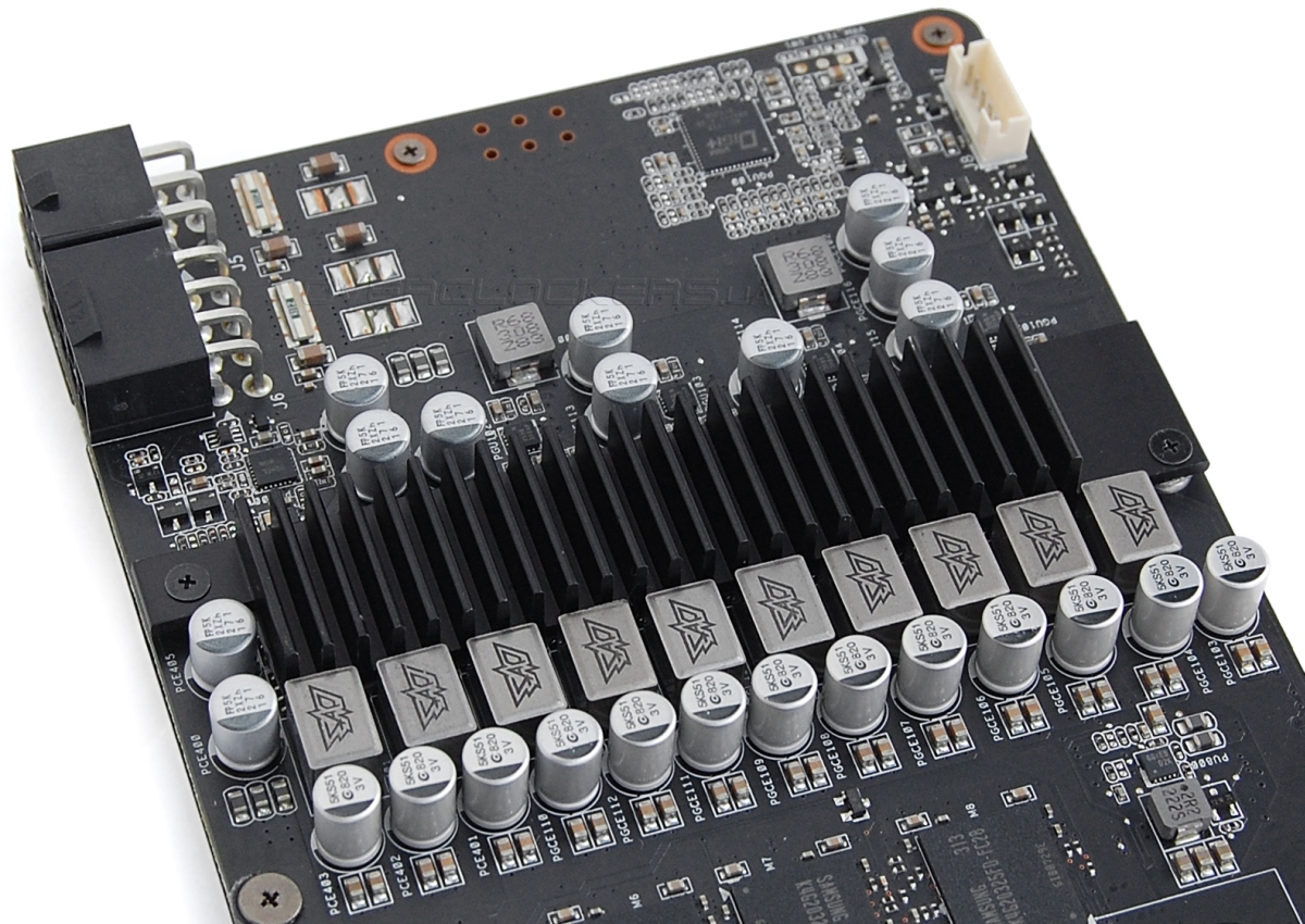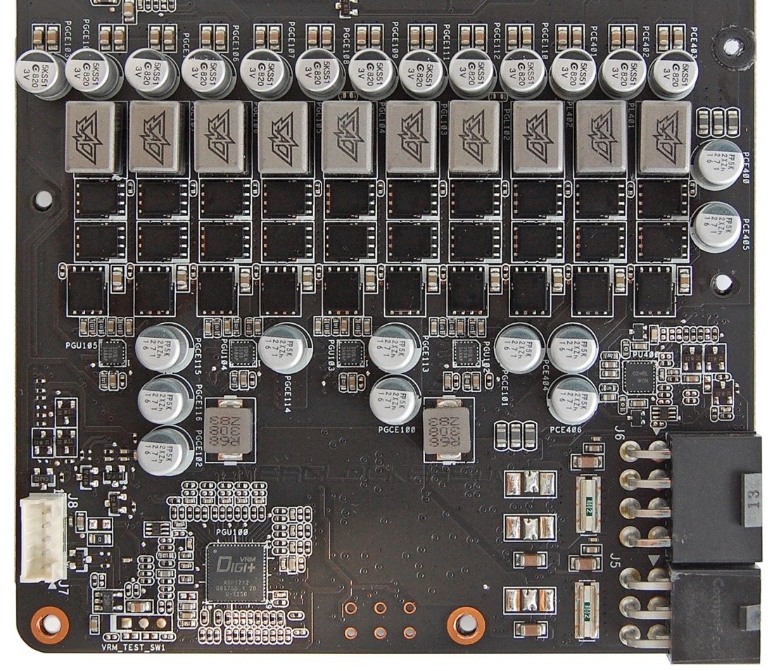 Реализован восьмифазный преобразователь напряжения GPU под управлением контроллера DIGI+ ASP1212. Подсистема питания памяти использует две фазы. Питание подключается к шести- и восмьмиконтактному разъемам.