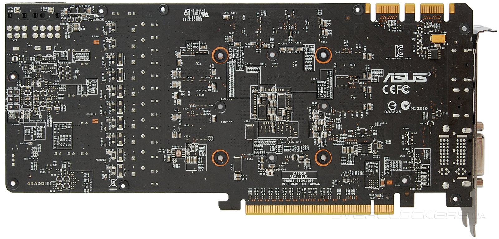 На небольшой открытой площадке имеется группа контактов для реализации технологии аппаратного контроля и мониторинга параметров VGA Hotwire при подключении через эти контакты видеокарты к системным платам ASUS ROG.
