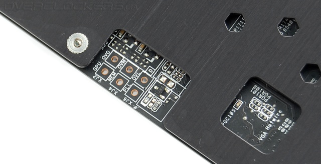 На небольшой открытой площадке имеется группа контактов для реализации технологии аппаратного контроля и мониторинга параметров VGA Hotwire при подключении через эти контакты видеокарты к системным платам ASUS ROG.
