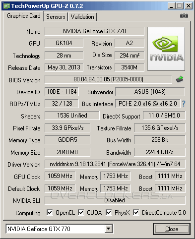 На данный момент GTX770-DC2OC-2GD5 — топовая версия GeForce GTX 770 от ASUS. Это предполагает повышенные рабочие частоты. Однако заводской разгон очень скромный. Базовая частота ядра повышена с рекомендованных 1045 МГц до 1059 МГц при Boost Clock 1111 МГц. Память вообще обошлась без коррекции частот и функционирует при эффективном значении 7010 МГц.