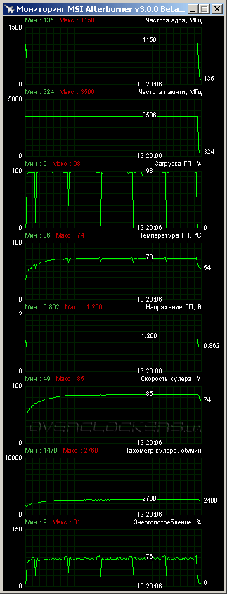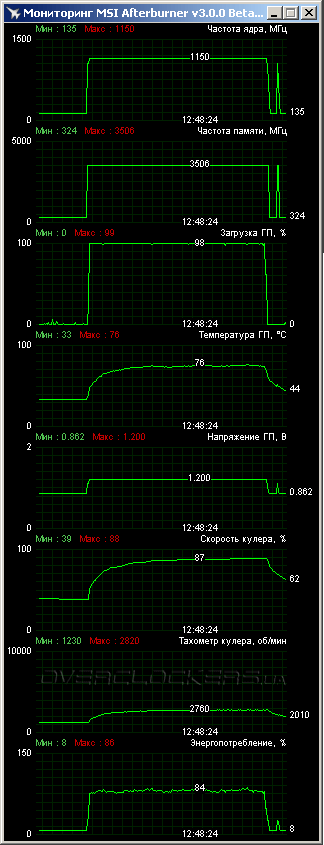 Реальная частота GPU в режиме Boost все время держалась на уровне 1150 МГц. В тяжелом графическом тесте Unigine Valley benchmark температура ядра не превысила 76 °C при 25 °C в помещении. Результат хороший, если вспомнить, что у референсных GeForce GTX 680 нормальная рабочая температура 81 °C. А тут рабочие частоты выше, а нагрев меньше.