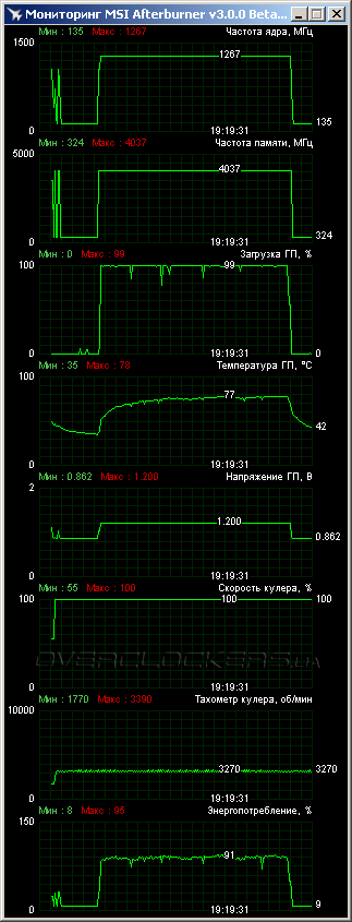 Разогнать графический процессор удалось до 1267 МГц в Boost при базовом значении 1189 МГц. Память стабильно заработала на 8074 МГц. Это выше результатов упоминавшегося видеоадаптера MSI N770 TF 2GD5/OC. В целом же, результат по GPU не рекордный. Среди GeForce GTX 680 нам попадались модели и с более высокими показателями. А вот по частотам памяти представители шестисотой серии однозначно слабее.