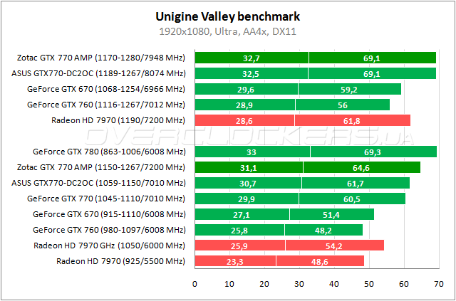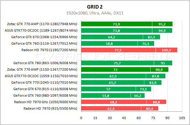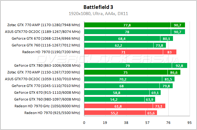 Zotac демонстрирует средний уровень быстродействия между обычным GeForce GTX 770 и GeForce GTX 780 в BioShock Infinite при весьма скромной разнице с ускоренным Radeon. При разгоне идет наравне с форсированным ASUS.
