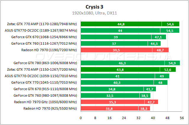 В игре Crysis 3 у героя нашего обзора минимальное отставание от результатов разогнанных GeForce GTX 770 и солидный отрыв от конкурента AMD.