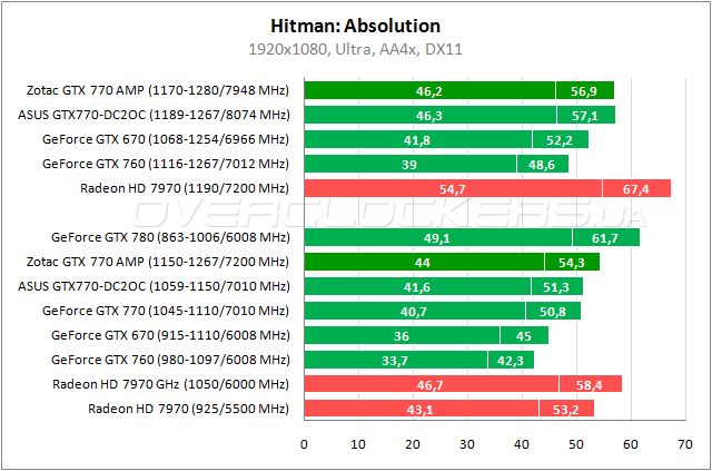 Еще сильнее позиции AMD в Hitman. Теперь Zotac обходит лишь младшую версию Radeon HD 7970.