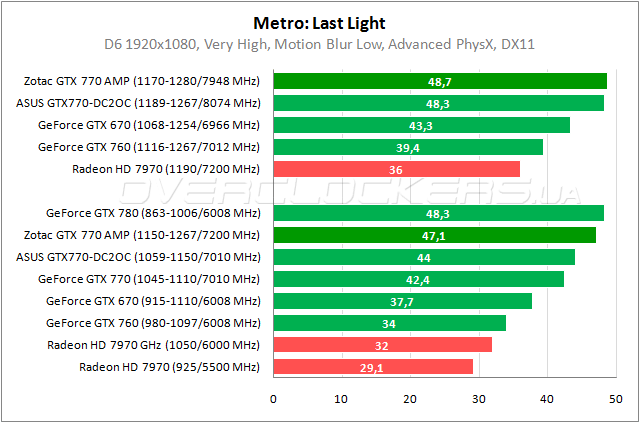 Zotac AMP! даже при заводских частотах максимально близок к старшему GeForce GTX 780, во второй тестовой сцене даже чуть быстрее. Карты Radeon занимают позиции аутсайдеров, при активном PhysX наблюдаются значительные просадки производительности.