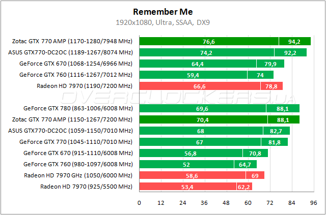 В игре Remember Me рассматриваемый видеоадаптер равен GeForce GTX 780 и на 20–28% быстрее Radeon HD 7970 GHz Edition.