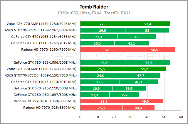 В Tomb Raider адаптер Zotac уступает старшему Radeon по минимальному fps. Разница с референсным GTX 770 на уровне 9–11%.