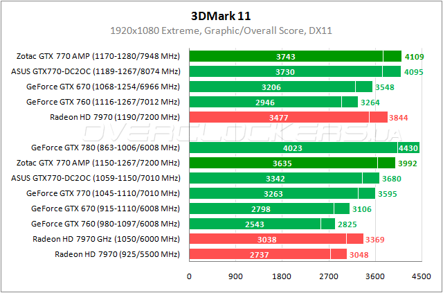 В номинале второе место после GeForce GTX 780. Внушительный отрыв от конкурента AMD. При разгоне одинаковые с ASUS результаты.
