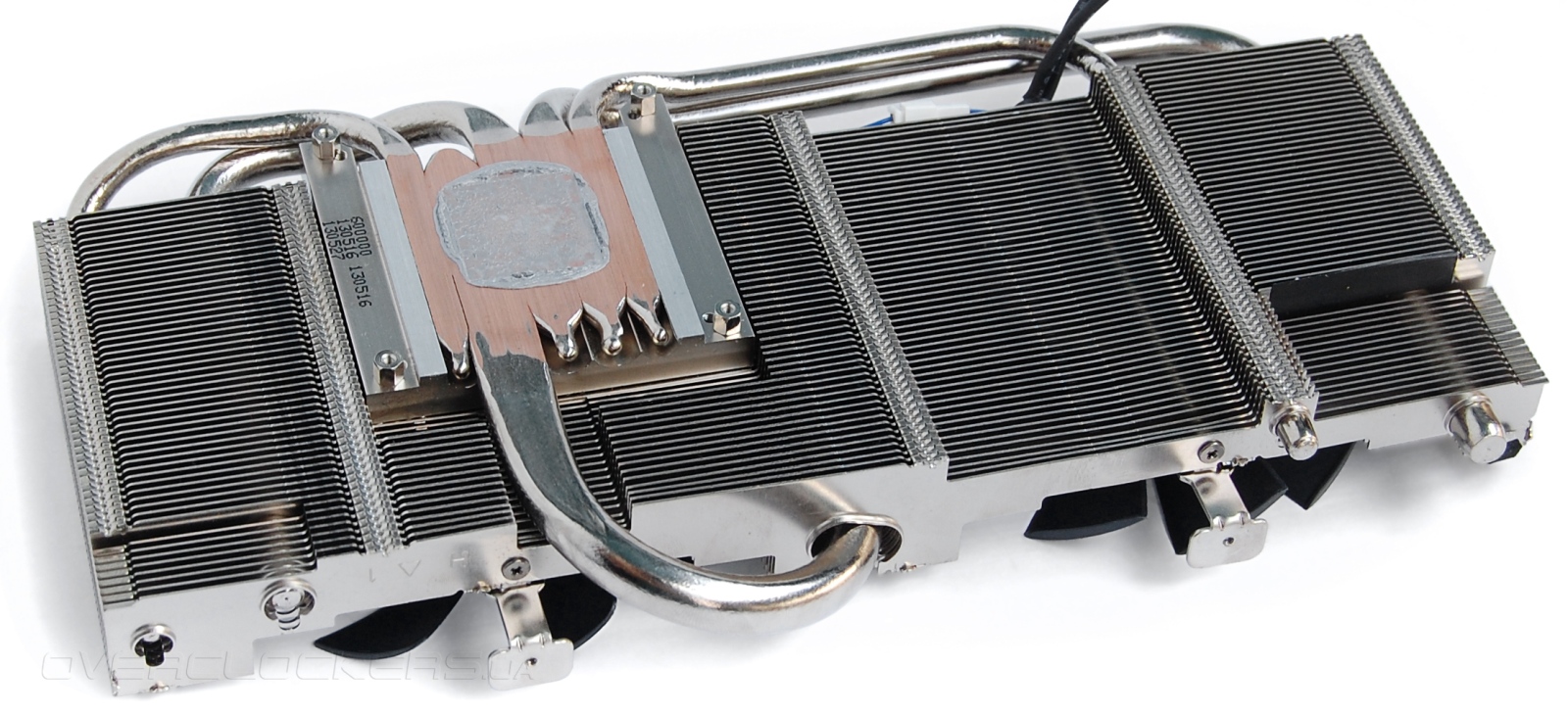 Взглянем ближе на систему охлаждения. Мощный радиатор пронизывают пять тепловых трубок, которые в основании настолько плотно подогнаны друг к другу, что между ними почти не видно швов. Благодаря прямому контакту трубки напрямую отводят тепло от поверхности кристалла. Но по отпечатку видно, что ни одна из крайних трубок с чипом не соприкасается.