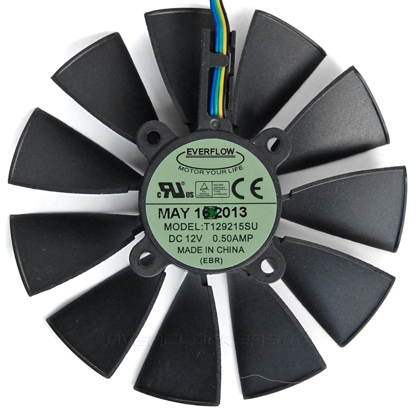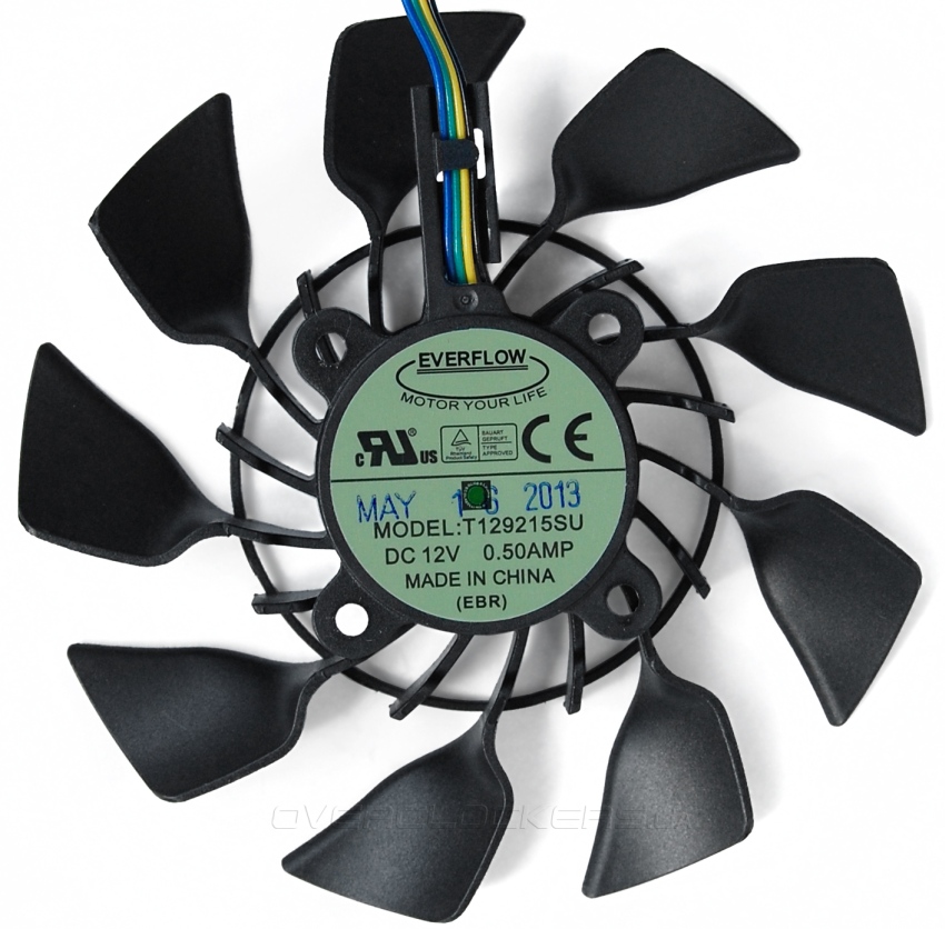 Вентиляторы Eveflow имеют одинаковый двигатель, о чем говорит идентичная маркировка T129215SU, но кардинально отличаются формой крыльчатки. Справа расположен вентилятор более традиционной формы, но с массивными крупными лопастями. Слева (возле интерфейсных разъемов) вентилятор уникального дизайна CoolTech Fan, который работает одновременно как осевой и центробежный. Боковые лопасти создают нисходящий воздушный поток, а лопатки организуют обдув боковых секций. Такой вентилятор применяется в ASUS GTX670-DCMOC-2GD5, где он расположен внутри радиатора-чаши. В данном случае применение столь необычного вентилятора должно улучшить обдув двух приподнятых зон радиатора и частично организовать выдув горячего воздуха за пределы корпуса.