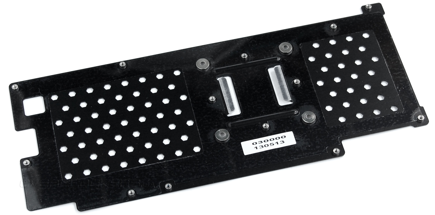 Пластина с обратной стороны радиатором не является, она просто защищает поверхность платы от внешних воздействий. Под эту пластину вдоль боковой грани устанавливается ребро жесткости. Все эти элементы придают дополнительную жесткость и препятствуют деформации текстолита под весом массивного кулера.