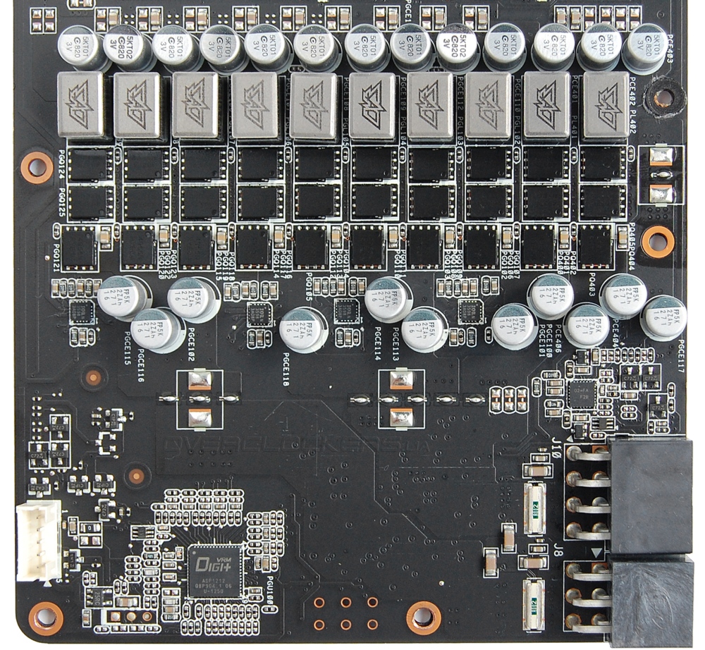 Графический процессор запитан от восьми фаз, память от двух. Применен стандартный для ASUS контроллер DIGI+ ASP1212.