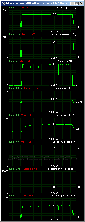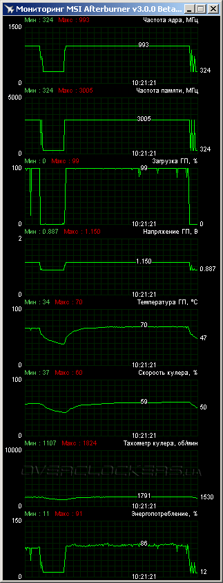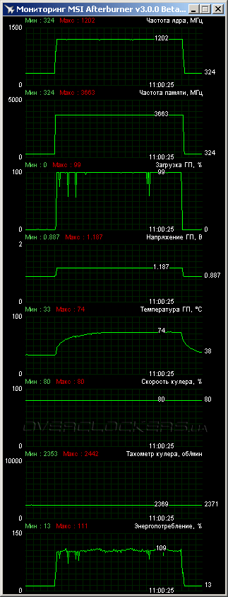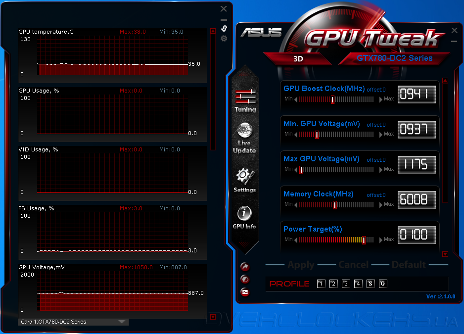 Для мониторинга и разгона можно использовать родную утилиту ASUS GPU Tweak. Мы же, как видно, использовали стандартный MSI Afterburner. Функциональность программ особо не отличается. Можно отметить разве что возможность раздельной регулировки минимального и максимального напряжения ядра в ASUS GPU Tweak.