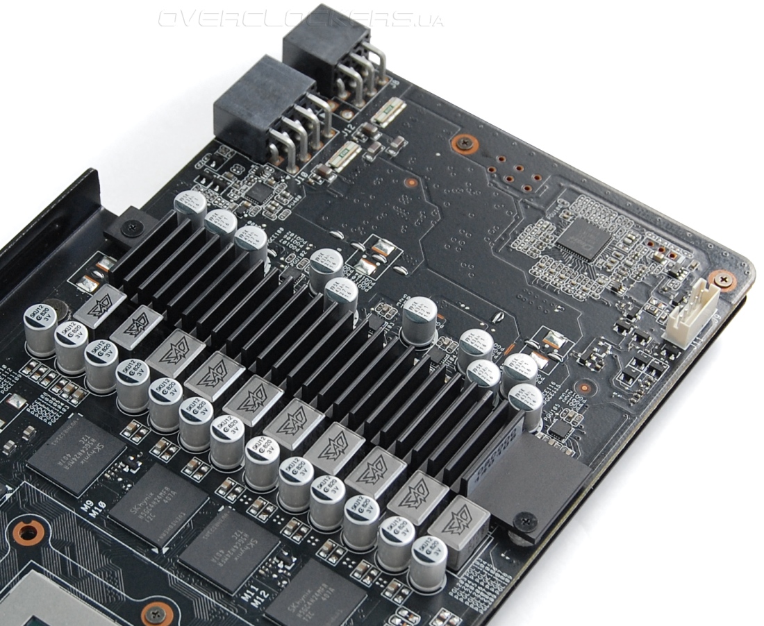 Микросхемы памяти лишены радиатора, но они хорошо обдуваются. На силовые компоненты узла питания установлена ребристая пластина. Пластина с обратной стороны платы радиатором не является, а играет роль усилительного элемента, предотвращая деформацию текстолита. Отмечу, что имеется еще и вполне стандартное ребро жесткости, которое тянется вдоль боковой грани.