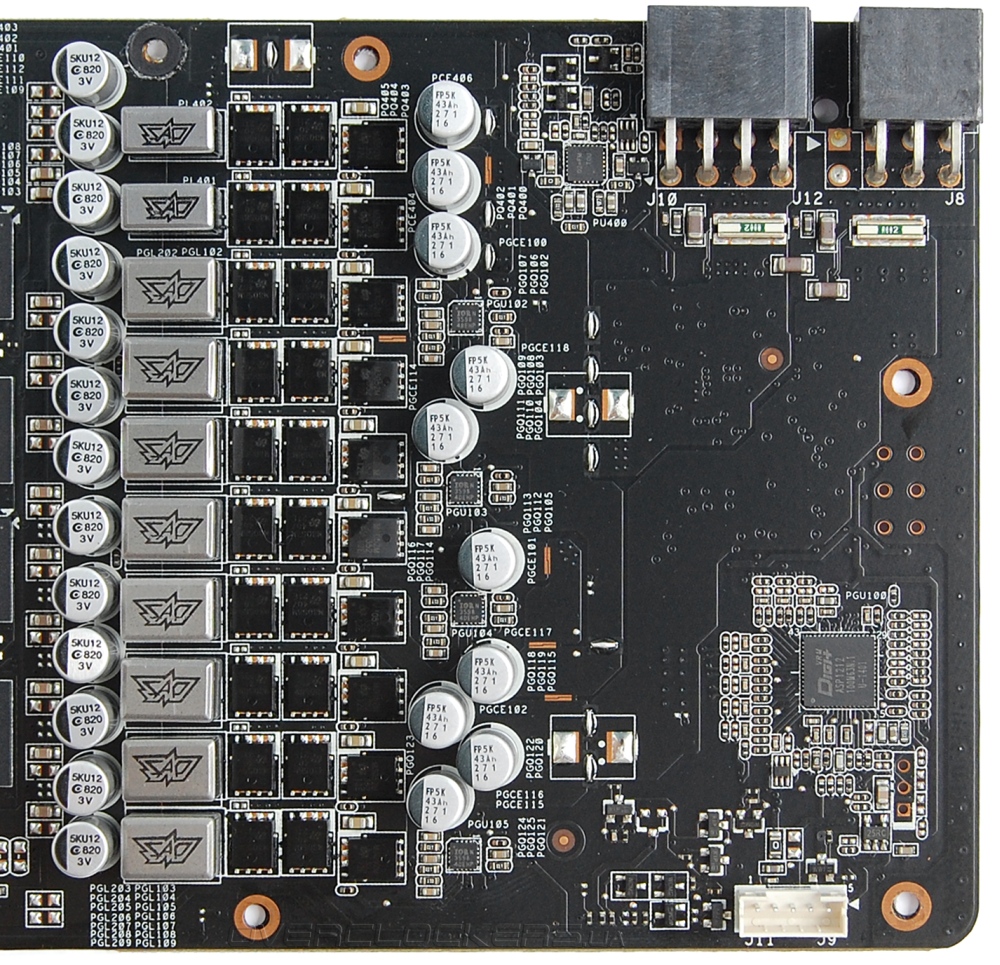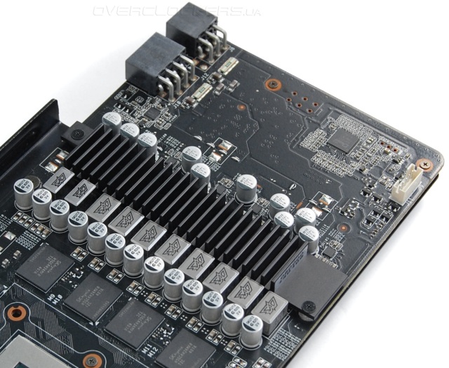 Графический процессор запитан от фосьмифазного преобразователя напряжения на базе контроллера DIGI+ ASP1212. Память запитана от двух фаз.