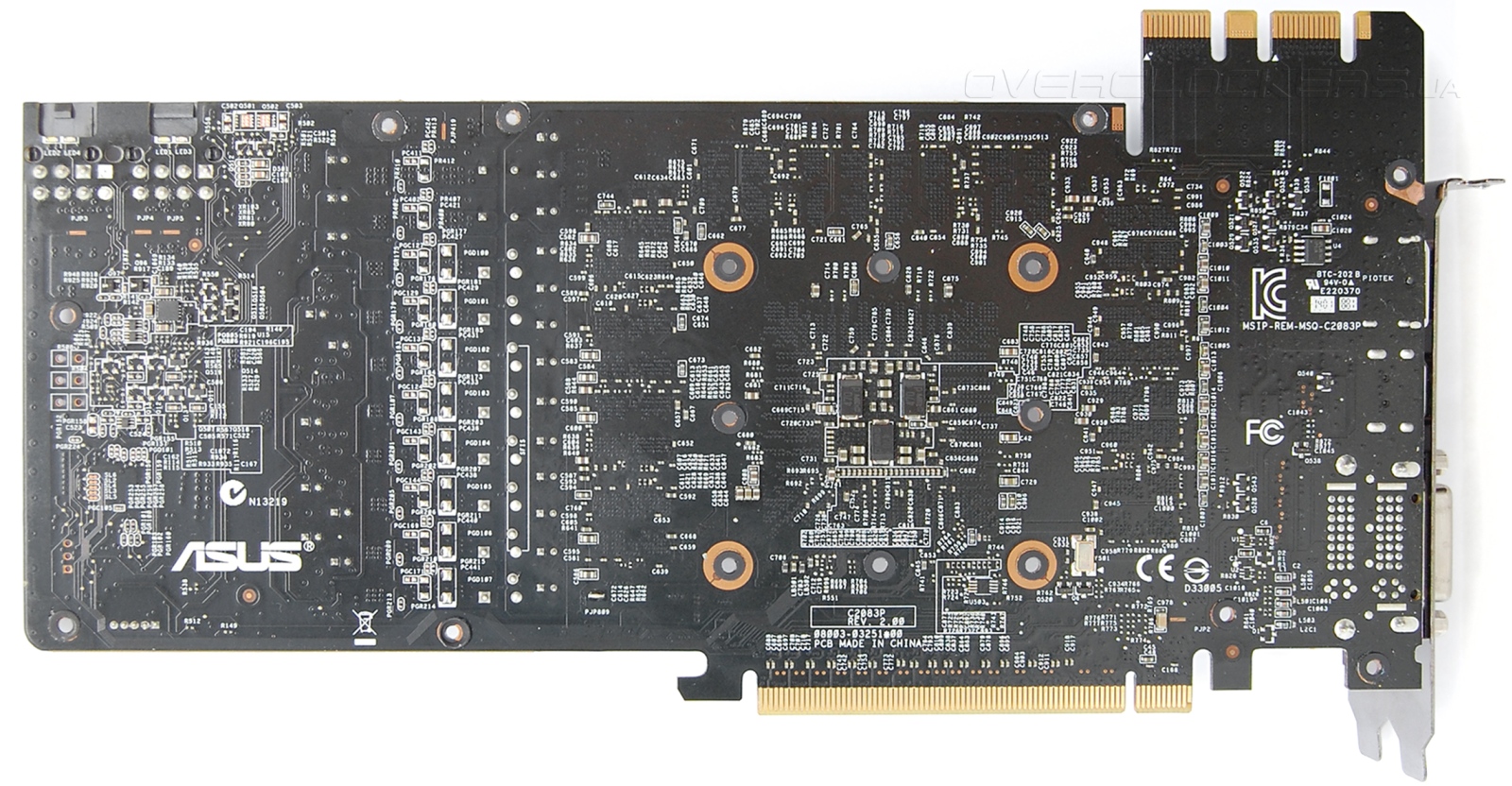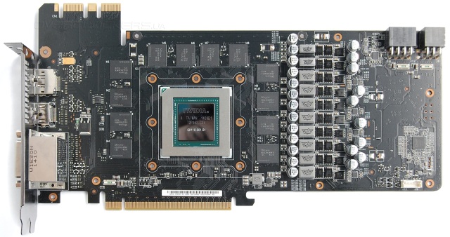 Печатная плата полностью повторяет дизайн старшего брата в лице ASUS GTX780TI-DC2OC-3GD5. Бросается в глаза выступающая площадка с разъемами под SLI. Это сделано для облегчения доступа к ним при наличии массивного охлаждения и выпирающего ребра жесткости. Дополнительное питание подключается к разъемам на шесть и восемь контактов.