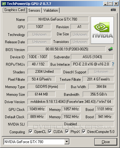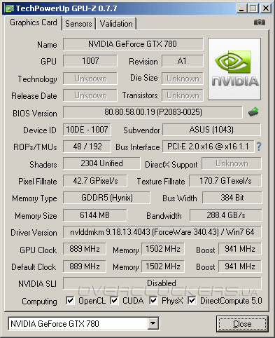 У Strix небольшой заводской разгон. Частота ядра с рекомендованного значения в 863 МГц повышена до 889 МГц при Boost Clock 941 МГц. Память работает на стандартном значении в 6008 МГц. Эти характеристики полностью соответствуют частотам ASUS GTX780-DC2OC-3GD5.