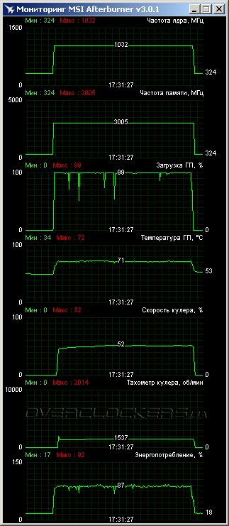 Хороший разгон, на уровне лучших представителей серии GTX 780. При этом все тесты легко были пройдены при скорости вентиляторов менее 2000 об/мин. Шум при этом был заметный, но не раздражающий.